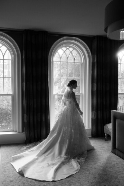 Dasha and Doug had a gorgeously romantic day on the coast of Maine. Taking on a classic palette of blues & white, the day was accentuated with a bank of fog that created a stunning backdrop. Dasha shone in a Monique Lhuillier lace gown for her ceremony, and changed into a Vera Wang gown with lace gloves for her reception. We styled Doug in a classic black tuxedo from J. Crew with Gucci loafers, and a navy blue suit from J. Crew to change into for the reception.