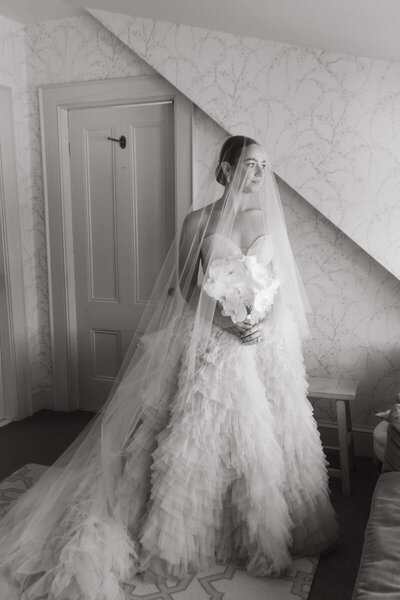 Anchored with the 2023 Pantone color of the year, Viva Magenta, this shoot was all about the classic coastal elegance that is found in the heart of Newport weddings. I opted for a gorgeous crepe gown that featured a dramatic organza bow, and pulled color into the look with a stunning floral embroidered veil.